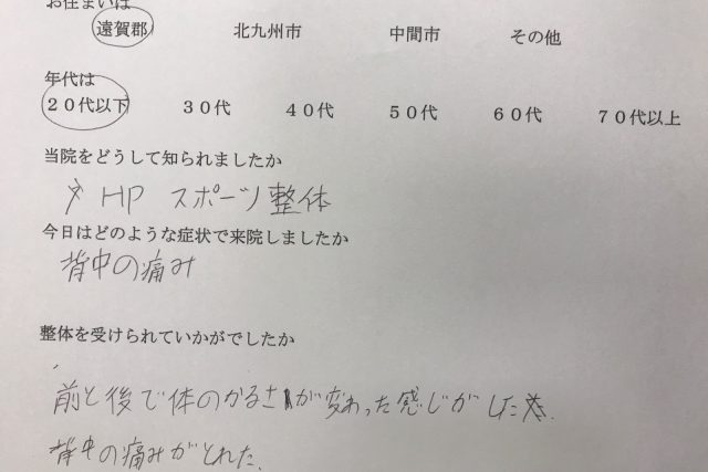 今日は背中と腰と首の痛みで来院しました。 治療2回目でかなり動きが良くなりました。 遠賀郡にお住いの