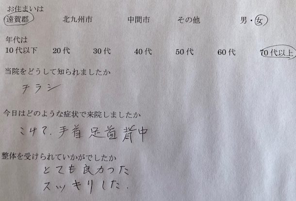 転んで手首を痛めてしまい、以前から足首と背中も痛かったので来院しました。
