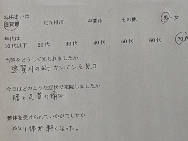 仕事が現役の時はよく来ていただいていましたが、今日は2年ぶりに来院していただき、やっぱり楽になるねと言っていただきました。