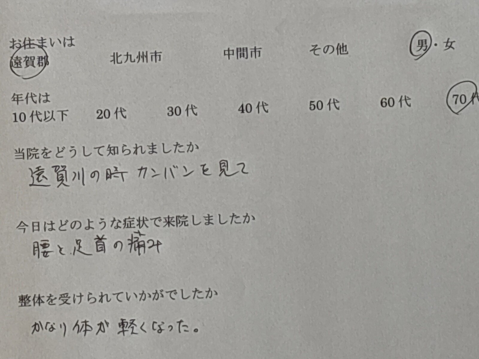 仕事が現役の時はよく来ていただいていましたが、今日は2年ぶりに来院していただき、やっぱり楽になるねと言っていただきました。