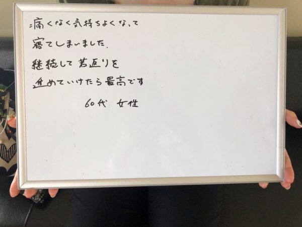 体の歪みも直してほしいとの要望もあり、一人一人に合ったきめ細かい施術を目指していきたいと思います。