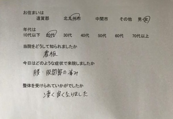 看板を見て知りました。 今日は腰と股関節の痛みで来院しました。 整体を受けて凄くよくなりました。 八幡西区にお住いの20代の方より。