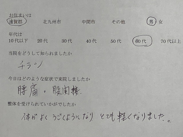チラシを見て知りました。 今日は腰痛と股関節痛で来院しました。 身体が動くようになり、とても軽くなりました。 遠賀郡にお住いの60代の方より。