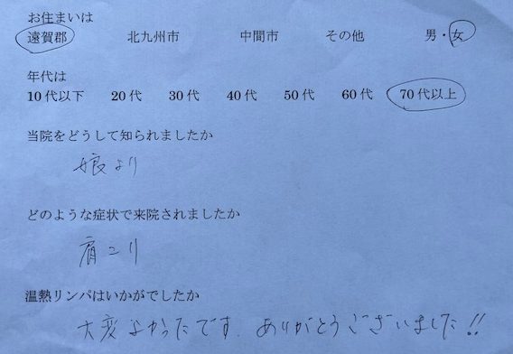 肩こりがあり温熱リンパ整体を受けました 2024/04/12 娘より紹介され温熱リンパを受けてみました。 肩こりがありましたが、大変よかったです。 ありがとうございました!! 遠賀郡にお住いの70代女性より