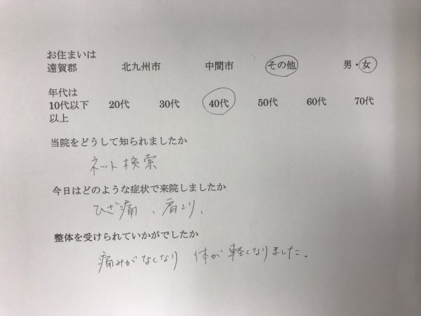 ネット検索で知りました。 今日は膝痛と肩こりで来院しました。 整体を受けて痛みがなくなり、体が軽くなりました。 直方市にお住いの40代の方より。
