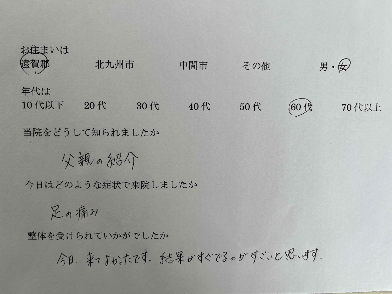 結果がすぐでるのがすごい!! 2025/09/22 父親の紹介で知りました。 足の痛みで来院しました。 整体を受けて今日来て良かったです。結果がすぐでるのがすごいと思います。 遠賀郡にお住いの60代女性より
