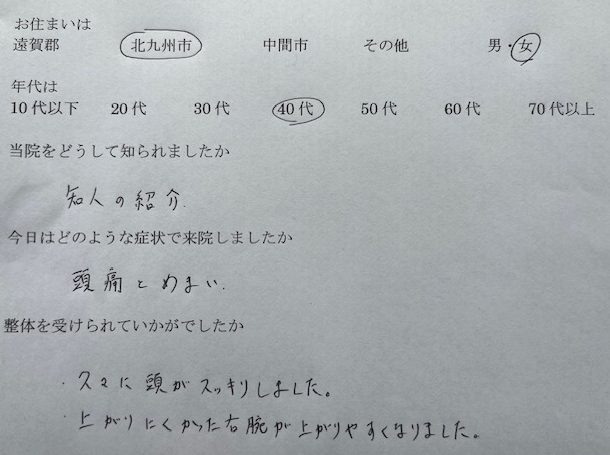 頭がすっきり!上がりにくかった右腕が上がりやすくなりました 2025/10/03 知人の紹介で来院しました。 頭痛とめまいの症状があり来院しました。 整体を受けて、久々に頭がすっきりしました。 上がりにくかった右腕が上がりやすくなりました。