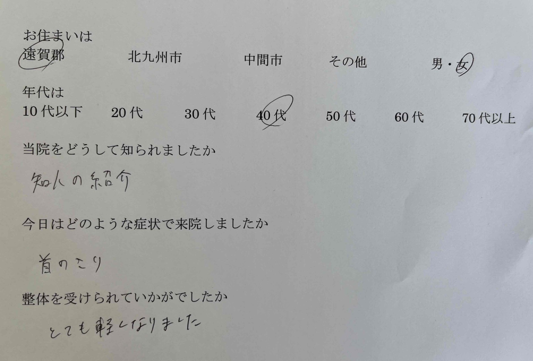 知人の紹介で知りました。 首のこりで来院しました。 整体を受けてとても軽くなりました。