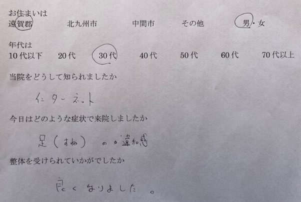 インターネットを見て知りました。 足の(すね)の違和感があり来院しました。 整体を受けて良くなりました。 遠賀郡にお住いの30代男性より
