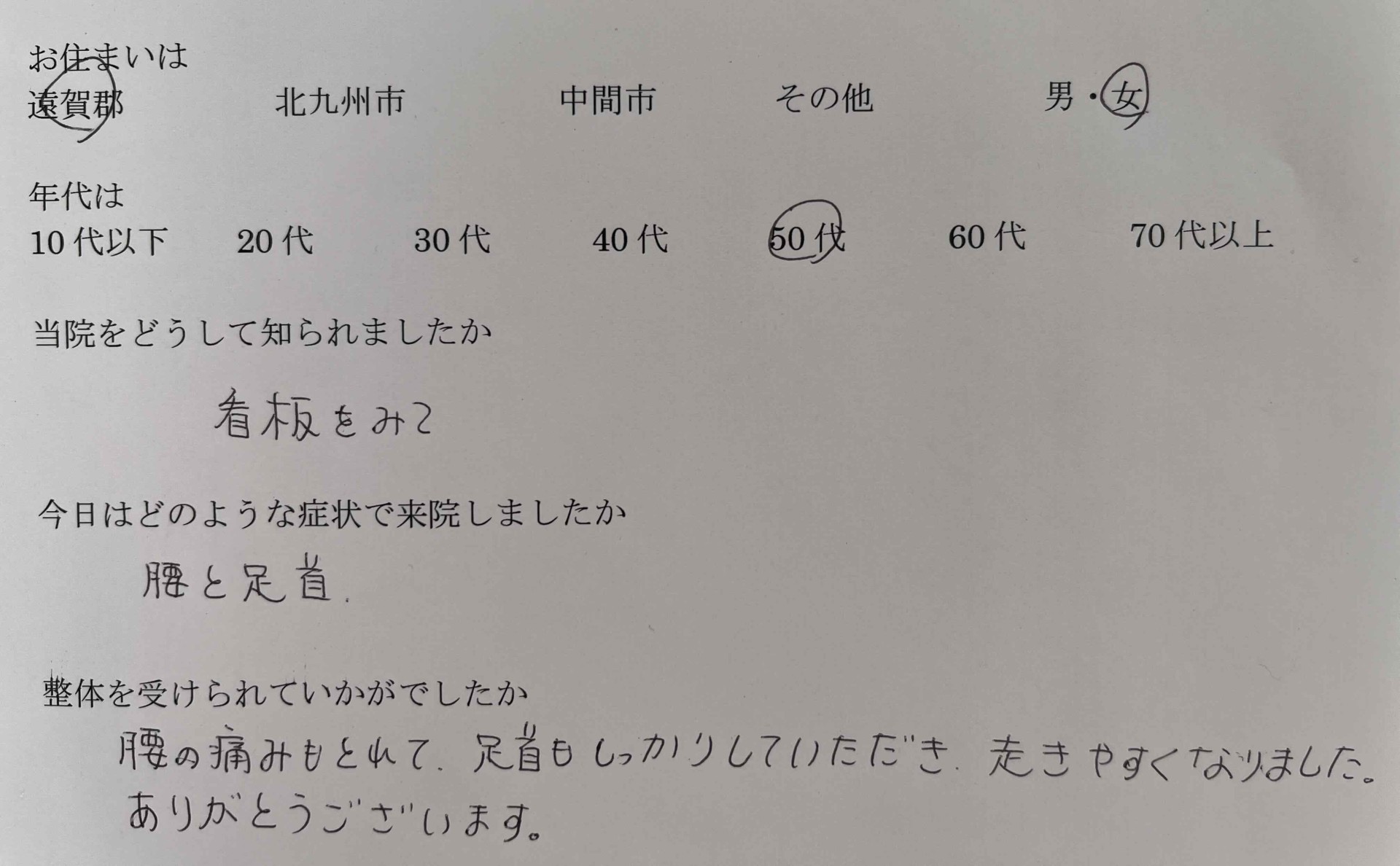腰の痛みがとれて歩きやすくなった!! 2025/10/27 看板を見て知りました。 腰と足首の痛みで来院しました。 腰の痛みもとれて首もしっかりしていただき歩きやすくなりました。 ありがとうございます。 遠賀郡にお住いの50代女性より