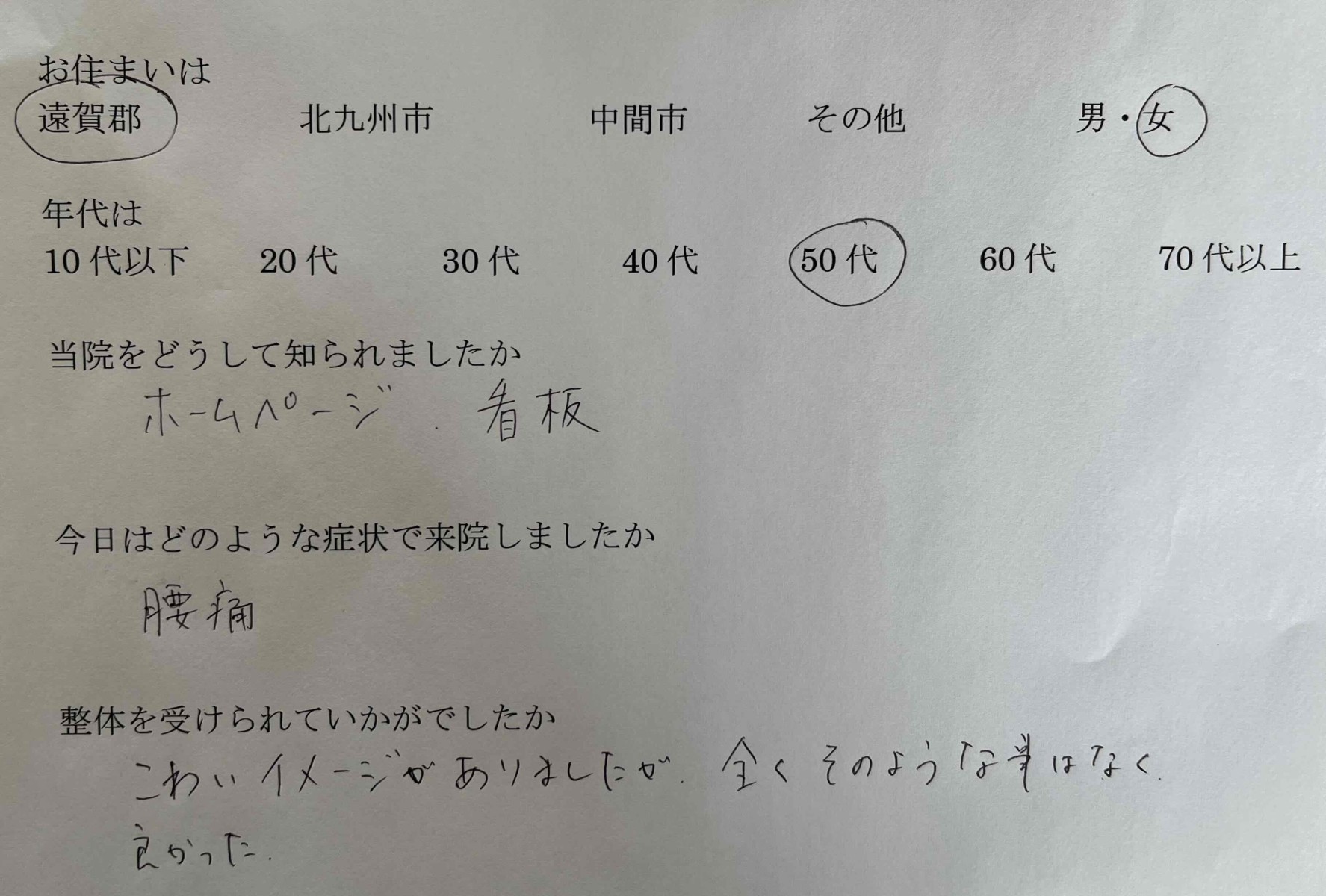 怖いイメージがあったけどそんなことなかった!! 2025/10/28 ホームページと看板を見て知りました。 腰痛で来院しました。 こわいイメージがありましたが全くそのようなことはなく良かった。 遠賀郡にお住いの50代女性より