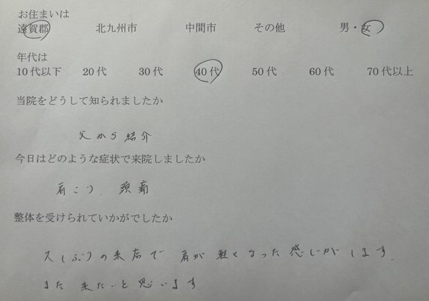 肩が軽くなった感じがします 2025/10/31 父からの紹介で来院しました。 肩こり、頭痛があり整体を受けました。 久しぶりの来店で肩がかるくなった感じがします。 また来たいと思います。 遠賀郡にお住いの40代女性より