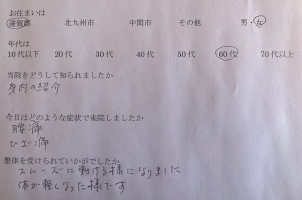スムーズに動けるようになりました!軽くなったようです 2025/11/07 身内の紹介で知りました。 腰痛、ひざ痛の症状があり来院しました。 整体を受けてスムーズに動けるようになりました。 体が軽くなった様です。 遠賀郡にお住いの60代女性より