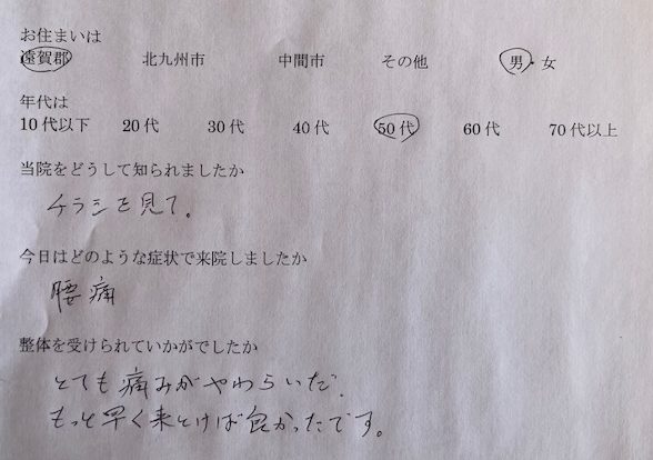 とても痛みがやわらいだ !もっと早く来とけばよかったです 2025/11/15 チラシを見て知りました。 腰痛があり来院しました。 整体を受けて、とても痛みが和らぎました。もっと早く来とけば良かったです。 遠賀郡にお住いの50代男性より