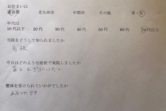 看板を見て知りました。 首と膝が痛くて整体を受けました。 整体を受けて良かったです。 遠賀郡にお住いの70代女性より