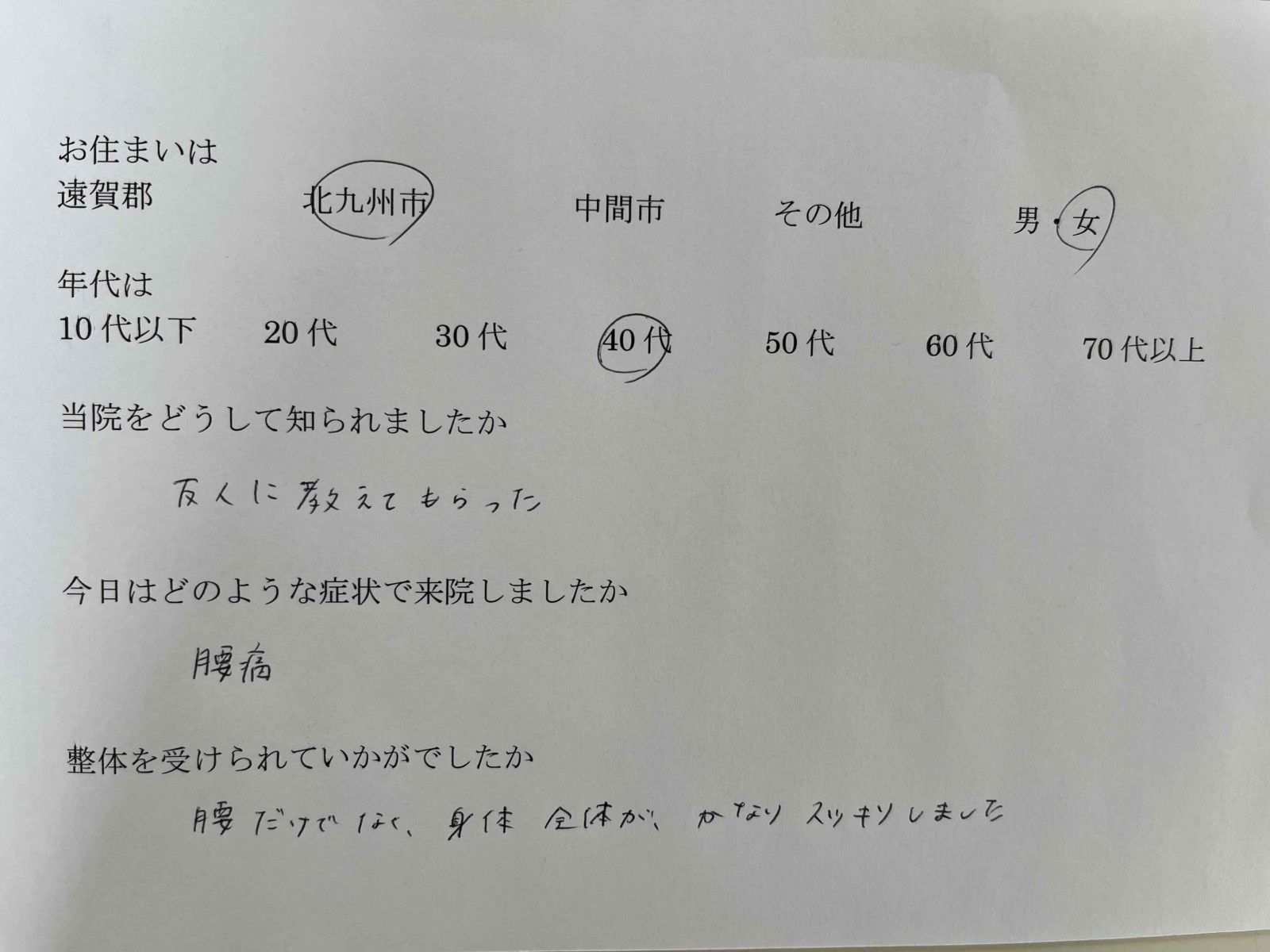 友人に教えてもらって知りました。 腰痛で来院しました。 整体を受けて腰だけではなくからだ全体がかなりスッキリしました。