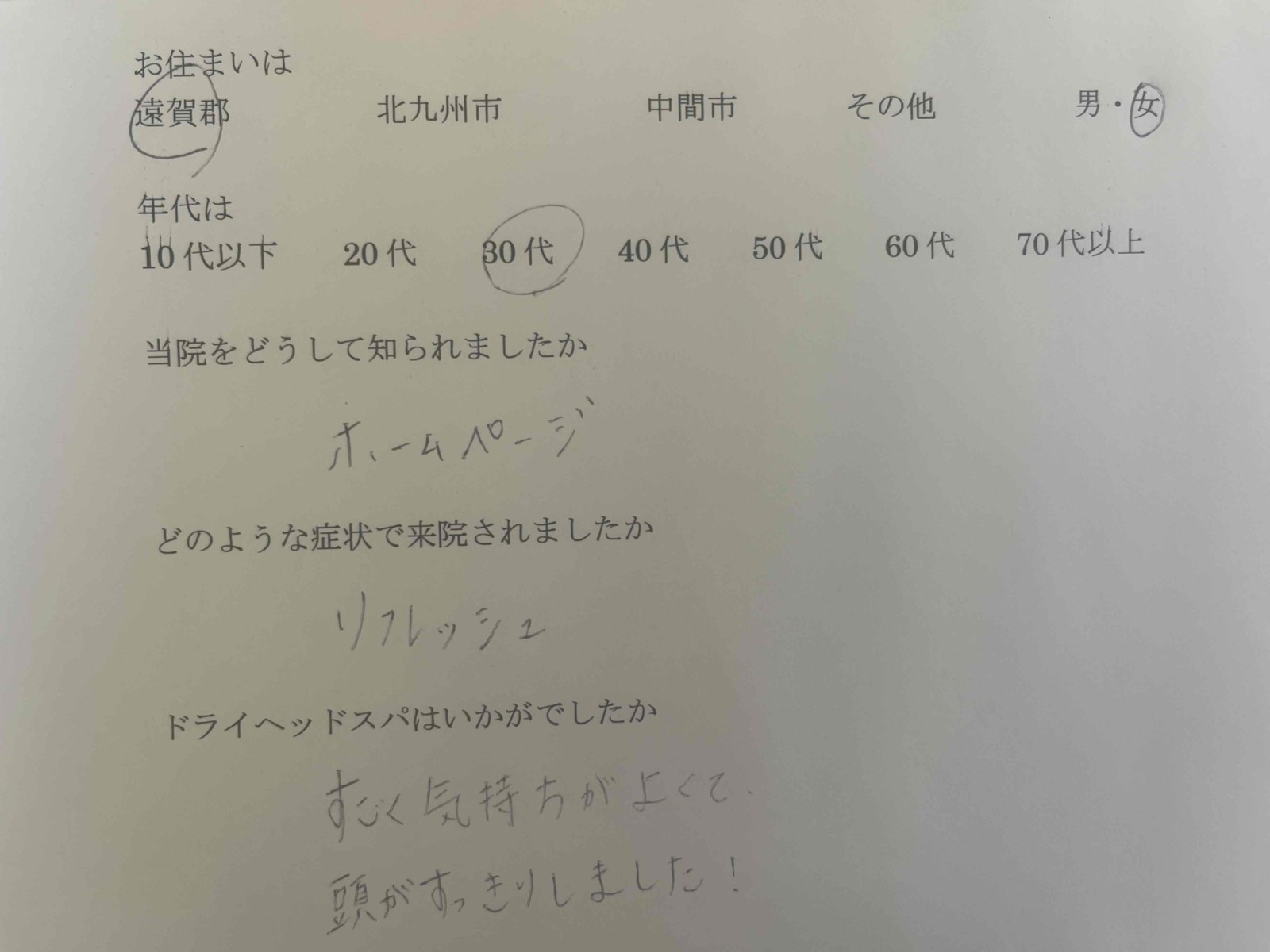 頭がスッキリしました! 2025/12/02 Googleからホームページを見て知りました。 腰痛で来院したら、ヘッドスパもあり、リフレッシュできるかなと思い受けてみました。 ドライヘッドスパを受けて、すごく気持ち良くて頭がスッキリしました。 遠賀郡にお住いの30代女性より
