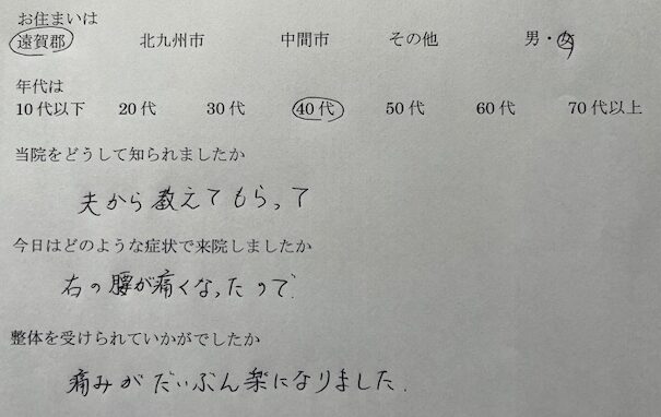 夫から教えてもらって知りました。 右の腰が痛くなったので来院しました。 整体を受けて痛みがだいぶ楽になりました。 遠賀郡にお住いの40代女性より
