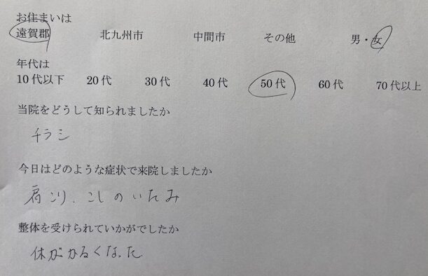 チラシを見て知りました。 肩こり、腰の痛みがあり来院しました。 整体を受けて、体がかるくなった。 遠賀郡にお住いの50代女性より