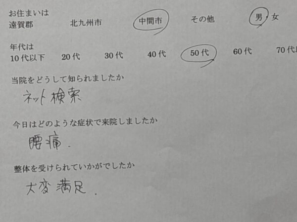 腰痛が楽になりました 2026/02/09 ネット検索で知りました。 今日は腰痛のため来院しました。 整体を受けて(痛みが軽くなり)大変満足です。 院長コメント この方は工場勤務で同じ姿勢で長時間作業することで腰だけでなく、肩や足にも強い張りがありました。 下半身から施術して身体全体をほぐすことにより、楽になってもらえたようです。