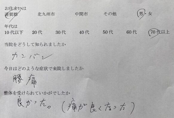 看板を見て知りました。 腰痛があり来院しました。 整体を受けて良かった。(痛みが良くなった) 遠賀郡にお住いの70代男性より