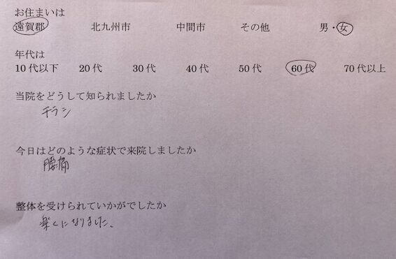チラシを見て知りました。 腰痛の症状があり来院しました。 整体を受けて、楽になりました。 遠賀郡にお住いの60代女性より