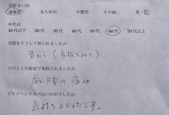 ドライヘッドスパ気持ち良かったです 2026/03/05 昔から(看板を見て)知ってました。 肩と腰の痛みがあり来院しました。 整体とドライヘッドスパを受けて気持ち良かったです。 遠賀郡にお住いの60代女性より
