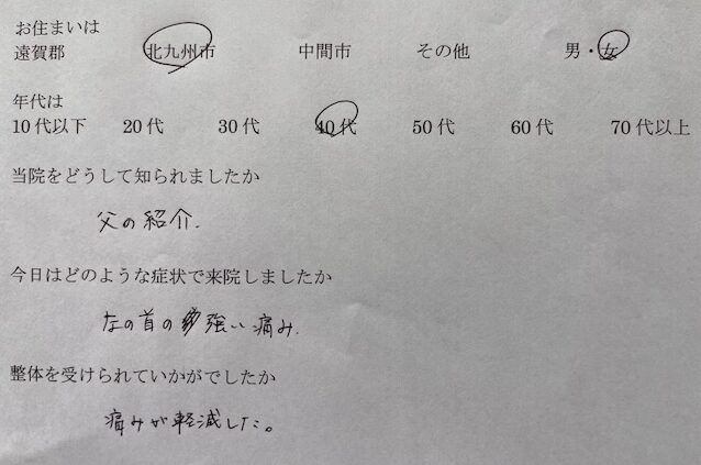 父の紹介で知りました。 左の首の強い痛みがあり来院しました。 整体を受けて痛みが軽減した。 北九州市にお住いの40代女性より