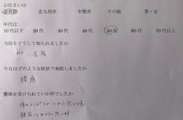 体のつっぱりがとれた感じ 2026/03/19 ホームページ、看板を見て知りました。 腰痛があり来院しました。 整体を受けて体のつっぱりがとれた感じです。 継続してみようと思います。 遠賀郡にお住いの50代より