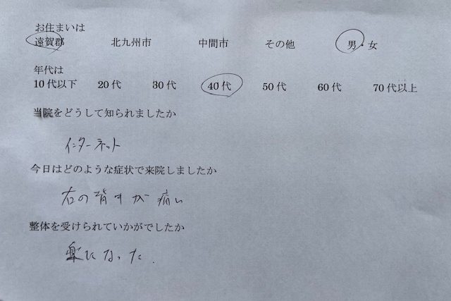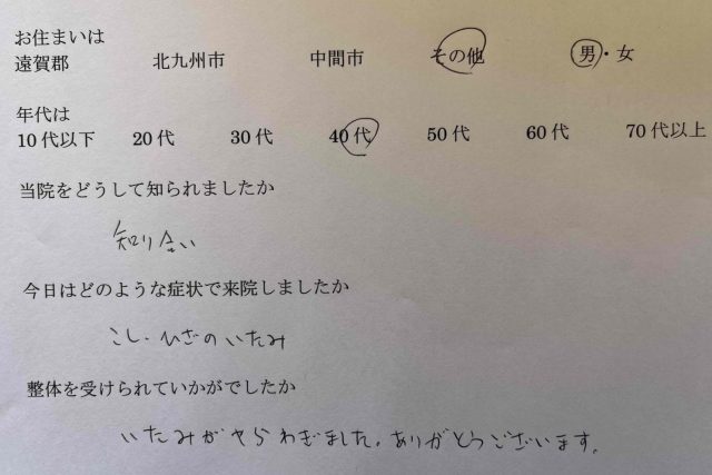 知り合いの紹介で知りました。 腰、膝の痛みで来院しました。 整体を受けて痛みが和らぎました。ありがと