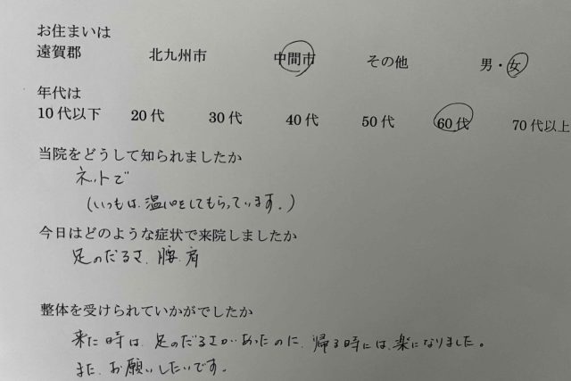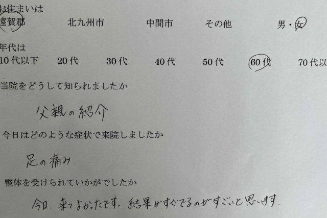 広告で知りました。 腕があがりにくく、ひざ、かかと、腰の痛みで来院しました。 整体を受けて腕がすっと
