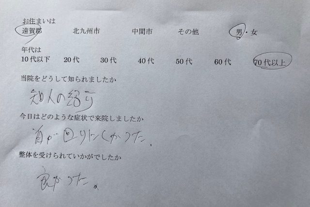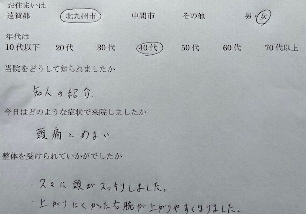知人の紹介で来院しました。 頭痛とめまいの症状があり来院しました。 整体を受けて、久々に頭がすっきり