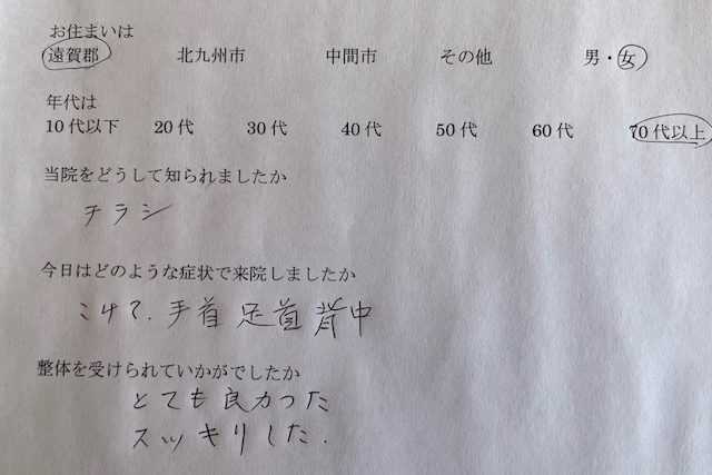 チラシを見て知りました。 転んで手首を痛めてしまい、以前から足首と背中も痛かったので来院しました。