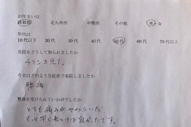 ホームページと看板を見て知りました。 腰痛で来院しました。 こわいイメージがありましたが全くそのよう