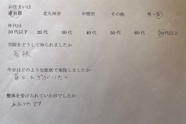 看板を見て知りました。 首と膝が痛くて整体を受けました。 整体を受けて良かったです。 遠賀郡にお住い